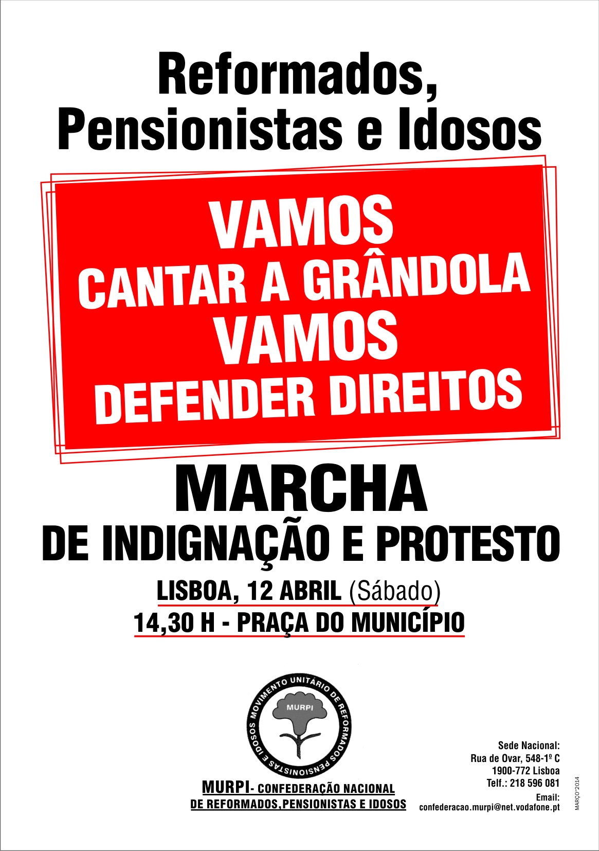 Esta Acção Nacional tem como objectivo a realização de acções em diversos pontos do País, sendo desde já convocada para o dia 12 de Abril uma Marcha de reformados, aposentados e pensionistas a realizar em Lisboa, a partir da Praça do Município, com o seguinte lema: POR ABRIL/CONTRA OS ROUBOS NAS PENSÕES/MARCHA DE INDIGNAÇÃO E PROTESTO.